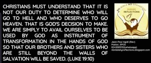 Beloved in the Lord, Christians must understand that it is not our duty to determine who will go to hell and who deserves to go to heaven. That is God’s decision to make. We are simply to avail ourselves to be used by God the instruments of transformation in the hands of God so that our brothers and sisters who are still beyond the walls of salvation will be saved. The Church represents Christ and must be an entity of compassion always welcoming all and sundry with the unconditional love of Jesus Christ, our Lord and Savior.