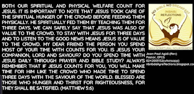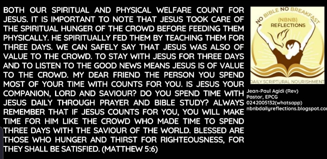 Both our Spiritual and physical welfare count for Jesus. It is important to note that Jesus took care of the spiritual hunger of the crowd before feeding them physically. He spiritually fed them by teaching them for three days. We can safely say that Jesus was also of value to the crowd. To stay with Jesus for three days and to listen to the Good News means Jesus is of value to the crowd. My dear friend the person you spend most of your time with counts for you. Is Jesus your companion, Lord and Saviour? Do you spend time with Jesus daily through prayer and Bible study? Always remember that if Jesus counts for you, you will make time for him like the crowd who made time to spend three days with the Saviour of the world. Blessed are those who hunger and thirst for righteousness, for they shall be satisfied. (Matthew 5:6)