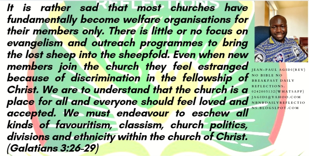 It is rather sad that most churches have fundamentally become welfare organisations for their members only. There is little or no focus on evangelism and outreach programmes to bring the lost sheep into the sheepfold. Even when new members join the church they feel estranged because of discrimination in the fellowship of Christ. We are to understand that the church is a place for all and everyone should feel loved and accepted. We must endeavour to eschew all kinds of favouritism, classism, church politics, division and ethnicity within the church of Christ. For we are greatly encouraged by Apostle Paul’s words to the Galatians that “for in Christ Jesus you are all sons (and daughters) of God, through faith. For as many of you as were baptized into Christ have put on Christ. There is neither Jew nor Greek(ethnicity), there is neither slave nor free(classism), there is no male and female (gender discrimination), for you are all one in Christ Jesus. And if you are Christ’s, then you are Abraham’s offspring, heirs according to promise. (Galatians 3:26-29) Shalom.