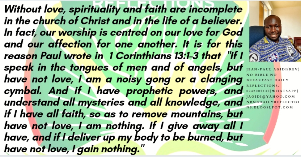 Without love, spirituality and faith are incomplete in the church of Christ and in the life of a believer. In fact, our worship is centred on our love for God and our affection for one another. It is for this reason Paul wrote in 1 Corinthians 13:1-3 that “If I speak in the tongues of men and of angels, but have not love, I am a noisy gong or a clanging cymbal. And if I have prophetic powers, and understand all mysteries and all knowledge, and if I have all faith, so as to remove mountains, but have not love, I am nothing. If I give away all I have, and if I deliver up my body to be burned, but have not love, I gain nothing.”