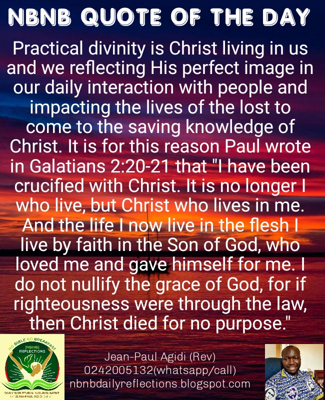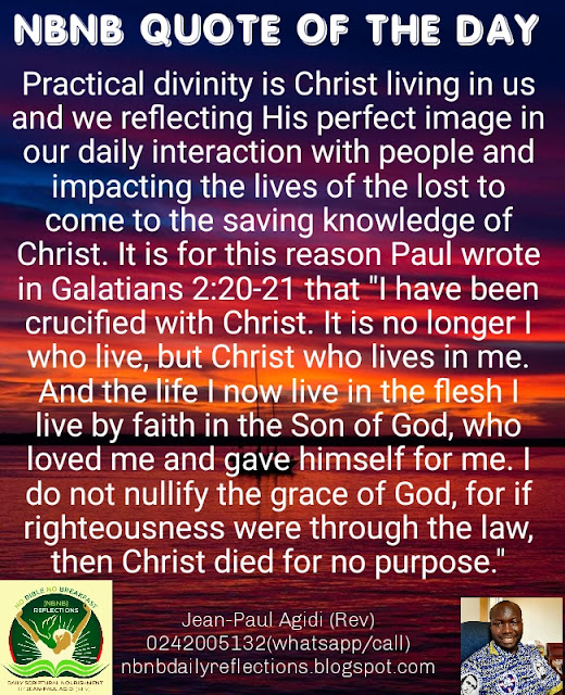 Practical divinity is Christ living in us and we reflecting His perfect image in our daily interaction with people and impacting the lives of the lost to come to the saving knowledge of Christ. It is for this reason Paul again wrote in Galatians 2:20-21 that “I have been crucified with Christ. It is no longer I who live, but Christ who lives in me. And the life I now live in the flesh I live by faith in the Son of God, who loved me and gave himself for me. I do not nullify the grace of God, for if righteousness were through the law, then Christ died for no purpose.” My dear friend the only way we can share the divinity of Christ is to believe in Him and through the power of the Holy Spirit He will be made manifest in us and the world will see the Lord at work in us and give glory to God. Practical divinity is living and possessing the image of Christ in us because through repentance and faith in Him, He lives in us. Shalom