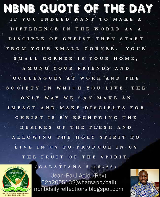 My dear friend, the desire of the flesh is strongly opposed to the desires and fruit of the Holy Spirit. When you live according to the flesh in your small corner then you are subject to the law because the law was indeed given to Moses to curtail the desires and works of the flesh. Most believers live a life of guilt because they are constantly being condemned by the law hence they are unable to make an impact as disciples of Christ in the small corner they find themselves. It is for this reason, Paul wrote that “For the desires of the flesh are against the Spirit, and the desires of the Spirit are against the flesh, for these are opposed to each other, to keep you from doing the things you want to do. But if you are led by the Spirit, you are not under the law. Now the works of the flesh are evident: sexual immorality, impurity, sensuality, idolatry, sorcery, enmity, strife, jealousy, fits of anger, rivalries, dissensions, divisions, envy, drunkenness, orgies, and things like these. I warn you, as I warned you before, that those who do such things will not inherit the kingdom of God.” (Galatians 5:17-21)