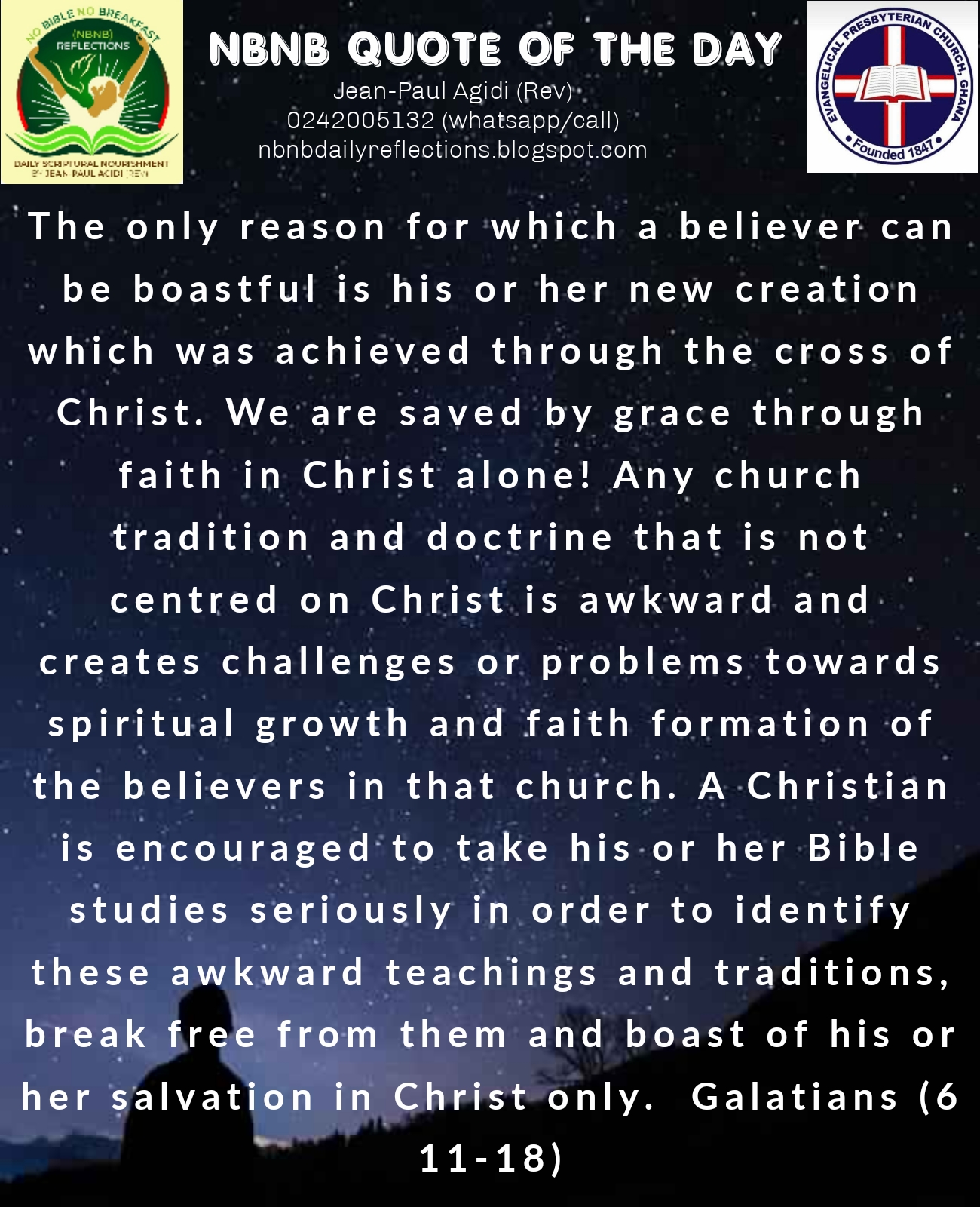 Christians must reject any teaching that will make our faith awkward or challenging to anyone who wants to come to Jesus and be saved. Jesus is the only foundation for our salvation and nothing else. It is for this reason Paul admonished the Galatian churches that “But far be it from me to boast except in the cross of our Lord Jesus Christ, by which the world has been crucified to me, and I to the world. For neither circumcision counts for anything, nor uncircumcision, but a new creation. And as for all who walk by this rule, peace and mercy be upon them, and upon the Israel of God. (Galatians 6:14-16). In other words, we rejoice and are proud that through the sacrifice of Christ we are no longer under the law but we are new creations through faith in Christ. Christian churches should guard against doctrines and teachings that remove Jesus from the centre of our faith and place much attention on human efforts and achievements. The only reason for which a believer can be boastful is his or her new creation which was achieved through the cross of Christ. We are saved by grace through faith in Christ alone! Any church tradition and doctrine that is not centred on Christ is awkward and creates challenges or problems towards the spiritual growth and faith formation of the believers in that church. A Christian is encouraged to take his or her Bible studies seriously in order to identify these awkward teachings and traditions, break free from them and boast of his or her salvation in Christ only. Shalom.