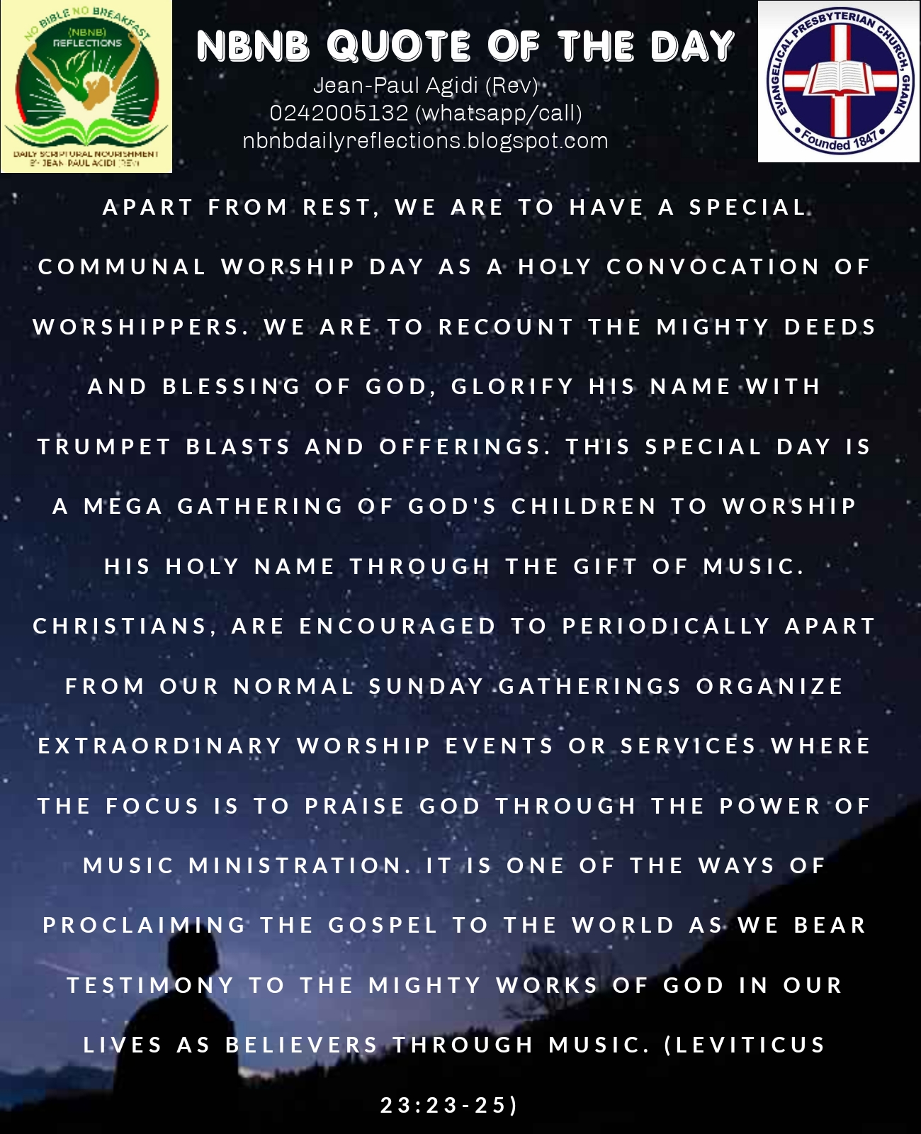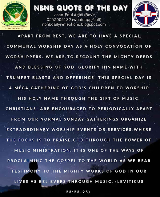 The second reason for observing the first day of the seventh month is to have “a memorial proclaimed with blast of trumpets, a holy convocation.” (Leviticus 23:24). We shall recall that in “Exodus 20:11” part of the ten commandments stipulates that “For in six days the LORD made heaven and earth, the sea, and all that is in them, and rested on the seventh day. Therefore the LORD blessed the Sabbath day and made it holy. (Exodus 20:11). Apart from rest, we are to have a special communal worship day as a holy convocation of worshippers. We are to recount the mighty deeds and blessing of God, glorify His name with trumpet blasts and offerings. This special day is a mega gathering of God’s children to worship His Holy name through the gift of music. Christians, are encouraged to periodically apart from our normal Sunday gatherings organize extraordinary worship events or services where the focus is to praise God through the power of music ministration. It is one of the ways of proclaiming the Gospel to the World as we bear testimony to the mighty works of God in our lives as believers through music. This is symbolised in today’s Scripture through trumpet blasts therefore my dear friend “Let us hold fast the confession of our hope without wavering, for he who promised is faithful. And let us consider how to stir up one another to love and good works, not neglecting to meet together, as is the habit of some, but encouraging one another, and all the more as you see the Day drawing near. (Hebrews 10:23-25). When we come together as a holy convocation of believers, let us always remember the Psalmist admonishment to “Praise him for his mighty deeds; praise him according to his excellent greatness! Praise him with trumpet sound; praise him with lute and harp! Praise him with tambourine and dance; praise him with strings and pipe! Praise him with sounding cymbals; praise him with loud clashing cymbals! Let everything that has breath praise the LORD! Praise the LORD!” (Psalms 150:2-6). The church of Christ is not a church of lamentation but a church of praise because He continues to be faithful to us. Shalom