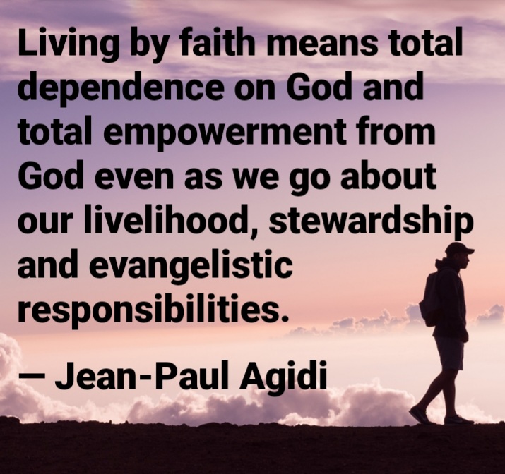 To live by faith means to depend on God with our feeble strength, trust and obey Him. “When Jesus had called the Twelve together, he gave them power and authority to drive out all demons and to cure diseases, and he sent them out to proclaim the kingdom of God and to heal the sick. He told them: “Take nothing for the journey—no staff, no bag, no bread, no money, no extra shirt. Whatever house you enter, stay there until you leave that town.” (Luke 9:1-4). Just like the disciples, we must live by faith by trusting and obeying Jesus. We are to not journey in life by focusing on our relationship with God and the task he has assigned us to perform in the lives of others. To live by faith means we will not be obsessed with what to wear, eat and spend but rather “…seek first his kingdom and his righteousness, and all these things will be given to you as well. (Matthew 6:33). Living by faith means total dependence on God and total empowerment from God even as we go about our livelihood, stewardship and evangelistic responsibilities. Shalom.