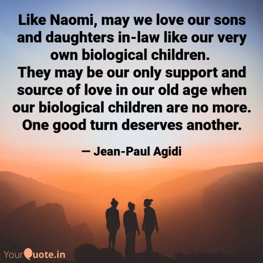 Beloved in the Lord, imagine Naomi had maltreated her two daughters-in-law when the sons were alive, she would have felt sorry for herself because Ruth and Orpah will not hesitate to leave soon after the demise of their husbands. It is evident that Naomi loved and cared dearly for her daughters-in-law just as she loved her own sons. Orpah eventually left, although she was hesitant but Ruth’s love and commitment to her mother-in-law law was beyond comprehension. Let us learn to love the spouses of our children as if they are our very own for tomorrow they may become our very own when our biological children are no more alive to love and support us in our old age. One good turn certainly deserves another. The grace of God was with Naomi in that she found the daughter that she never had in Ruth. God continues to work in miraculous ways in our lives, let us continue to trust in Him even when we are saddled with challenges and uncertainties of life, He makes a way where there is none. Shalom.