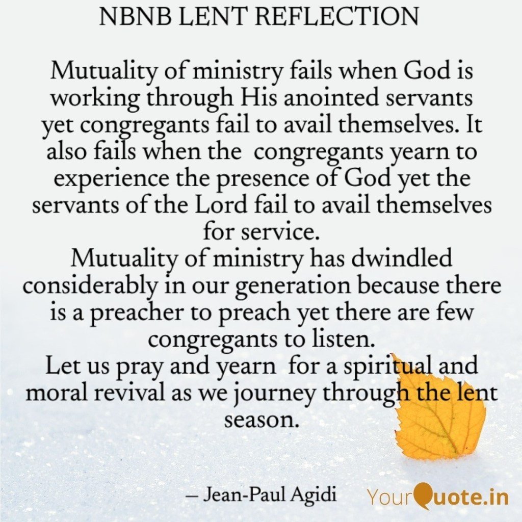 Mutuality of ministry was demonstrated in Luke 4:42-43, “And when it was day, he departed and went into a desolate place. And the people sought him and came to him, and would have kept him from leaving them, but he said to them, “I must preach the good news of the kingdom of God to the other towns as well; for I was sent for this purpose.”. In other words, Jesus ministered to the people by preaching and delivering them from the oppression and bondage of sicknesses and unclean spirits and the people on the hand, yearned or “sought him from leaving them, would have kept him from leaving”. Mutuality of ministry fails when God is working through His anointed servants yet congregants or members of the church fail to avail themselves. It also fails when the congregants yearn to experience the presence of God yet the servants of the Lord fail to avail themselves for ministry. Mutuality of ministry has dwindled considerably in many of our churches because there is a preacher to preach yet there are very few congregants to listen. Many Christians of our time are obsessed with money, work, entertainment and would easily give excuses for not dedicating their time and energy to serve God.