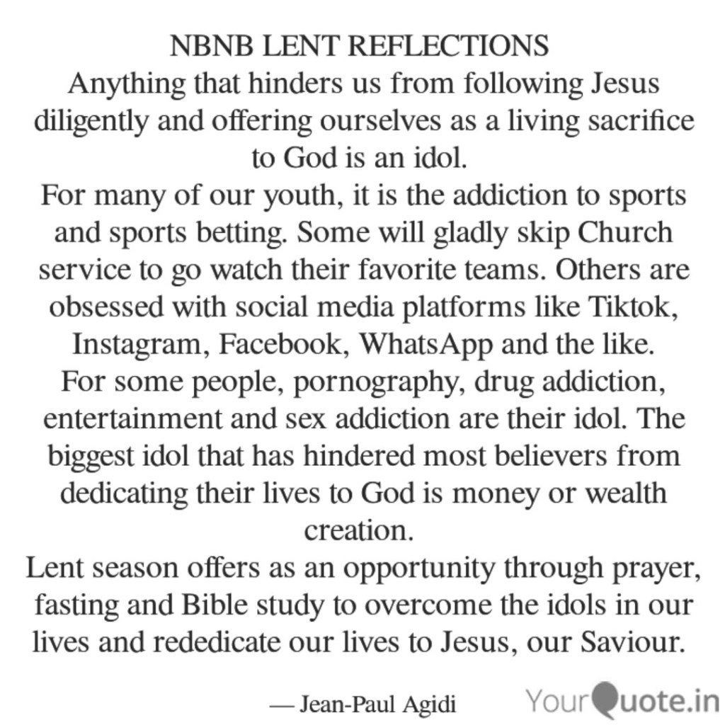 Dear friend until you get rid of the idol in your life you will remain part of the group Jesus will address as “Not everyone who says to me, ‘Lord, Lord,’ will enter the kingdom of heaven, but the one who does the will of my Father who is in heaven. On that day many will say to me, ‘Lord, Lord, did we not prophesy in your name, and cast out demons in your name, and do many mighty works in your name?’ And then will I declare to them, ‘I never knew you; depart from me, you workers of lawlessness.’ (Luke 7:21-23). Lent season offers an opportunity get rid of the idols in our lives through prayer, fasting and Bible studies. Let us take advantage of the lent season and do the needful as believers. Shalom.