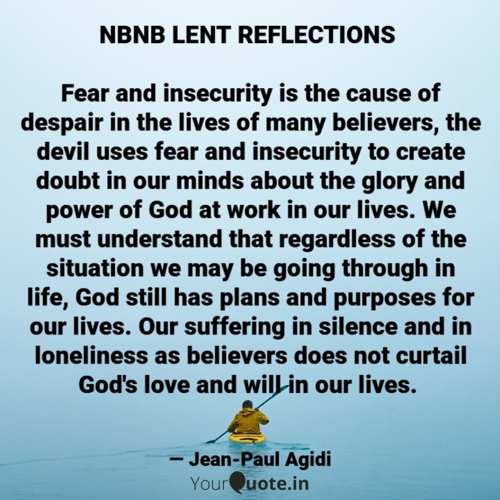 Dear friend in the Lord, one wonders why Elijah, a prophet of God through whom God had performed great miracles will experience despair. Elijah was an ordinary human being like us who entertained fear and insecurity in the face of danger. Fear and insecurity is the cause of despair, the devil uses fear and insecurity to create doubt in our minds about the glory and power of God at work in our lives. We must understand that regardless of the situation we may be going through in life, God still has plans and purposes for our lives. Our suffering in silence and in loneliness as believers does not curtail God’s love and will in our lives. We are assured by Jesus that “Blessed are those who are persecuted because of righteousness, for theirs is the kingdom of heaven. “Blessed are you when people insult you, persecute you and falsely say all kinds of evil against you because of me. Rejoice and be glad, because great is your reward in heaven, for in the same way they persecuted the prophets who were before you.” (Matthew 5:10-12). In other words, like the aviation industry, God has not promised us a turbulent-free flight but He has assured us of a safe landing, therefore do not despair when challenges, oppositions and persecutions come your way on account of your faith in God, by faith and in hope, say with the Prophet Isaiah that “Surely God is my salvation; I will trust and not be afraid. The LORD, the LORD himself, is my strength and my defense; he has become my salvation. ” (Isaiah 12:2). Be emboldened this lent season and believe that, like Elijah, the Lord sees and understands your struggles. He provides His angels to guide and encourage you to overcome the battle. Remember as we journey through the lent season and beyond that “Do not be afraid or discouraged because of this vast army. For the battle is not yours, but God’s.” (2 Chronicles 20:15). Shalom.