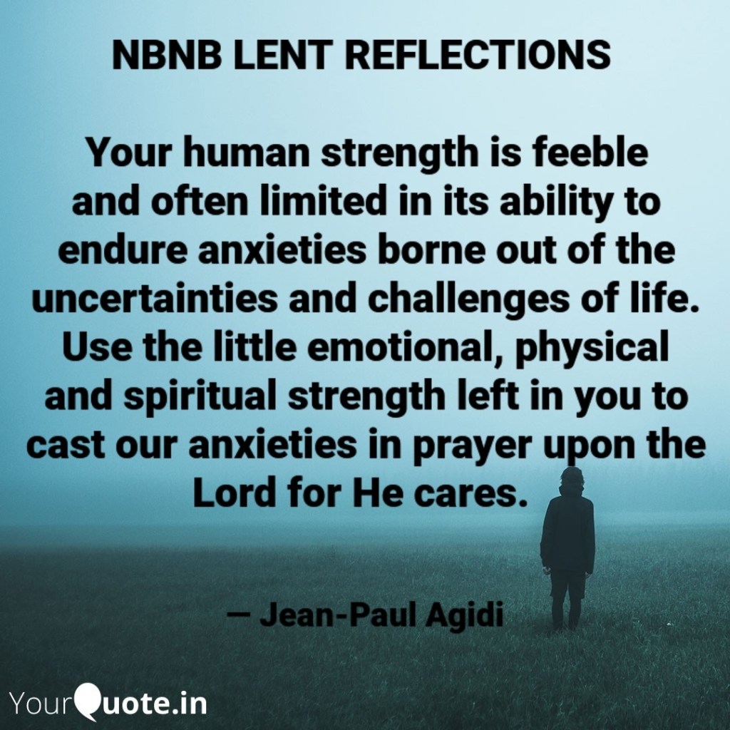 Peter encourages his audience who were Christians going through suffering on account of their faith in Christ. Peter reminds the recipients of his letter that since they were the disciples and children of God, they were not alone in their suffering, he therefore encourages them to “Cast all your anxiety on him because he cares for you.” (1 Peter 5:7). Dear friend, we must understand that we are feeble or weak as human beings and are limited in our ability to endure anxiety. It is for this reason, we must use the little emotional, physical and spiritual strength left in us to cast our anxieties in prayer upon the Lord.