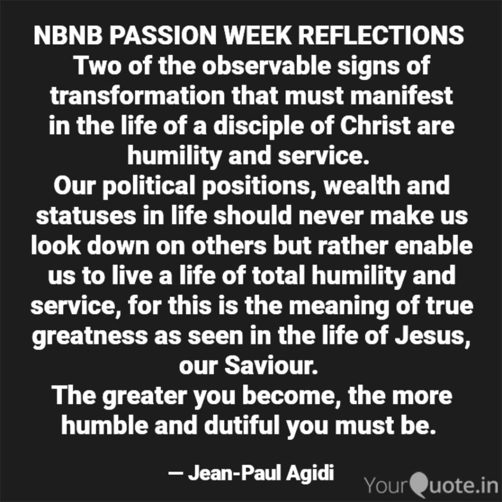 Beloved in the Lord, two of the fundamental hall marks of Christianity are humility and service. Jesus our Lord and Saviour is the personification humility and service. The passion week reminds us that no matter how great we are positioned in life let us humble ourselves for we have been called to serve and follow the examples of our Master Jesus. We must be humble and serve one other everywhere we find ourselves. Our political positions, wealth and status in life should never make us look down on others but rather enable us live a life of humility and service, for this the meaning of true greatness. Shalom.