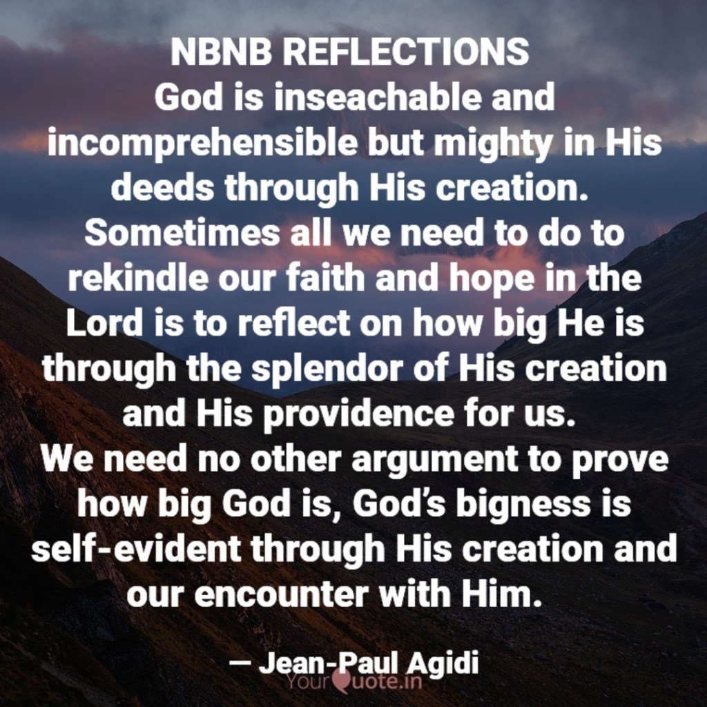 Again, our God is big because everything we have including our very lives was given to us by Him. God said to Job “Who has first given to me, that I should repay him? Whatever is under the whole heaven is mine. (Job 41:11). God owes us nothing but we owe Him everything, this is how big our God is. It is therefore our daily responsibility to show gratitude to God for our lives regardless of the situation we may find ourselves in. Job wanted answers to why he was suffering but God’s answer in Job 41:1-15 pointed Him to reflect on His power and the awesomeness of His creation. Sometimes all we need to do to rekindle our faith and hope in the Lord is to reflect on how big He is through the splendor of His creation and His providence for us. We need no other argument to prove how big God is, God’s bigness is self-evident through His creation and our encounter with Him. Shalom.