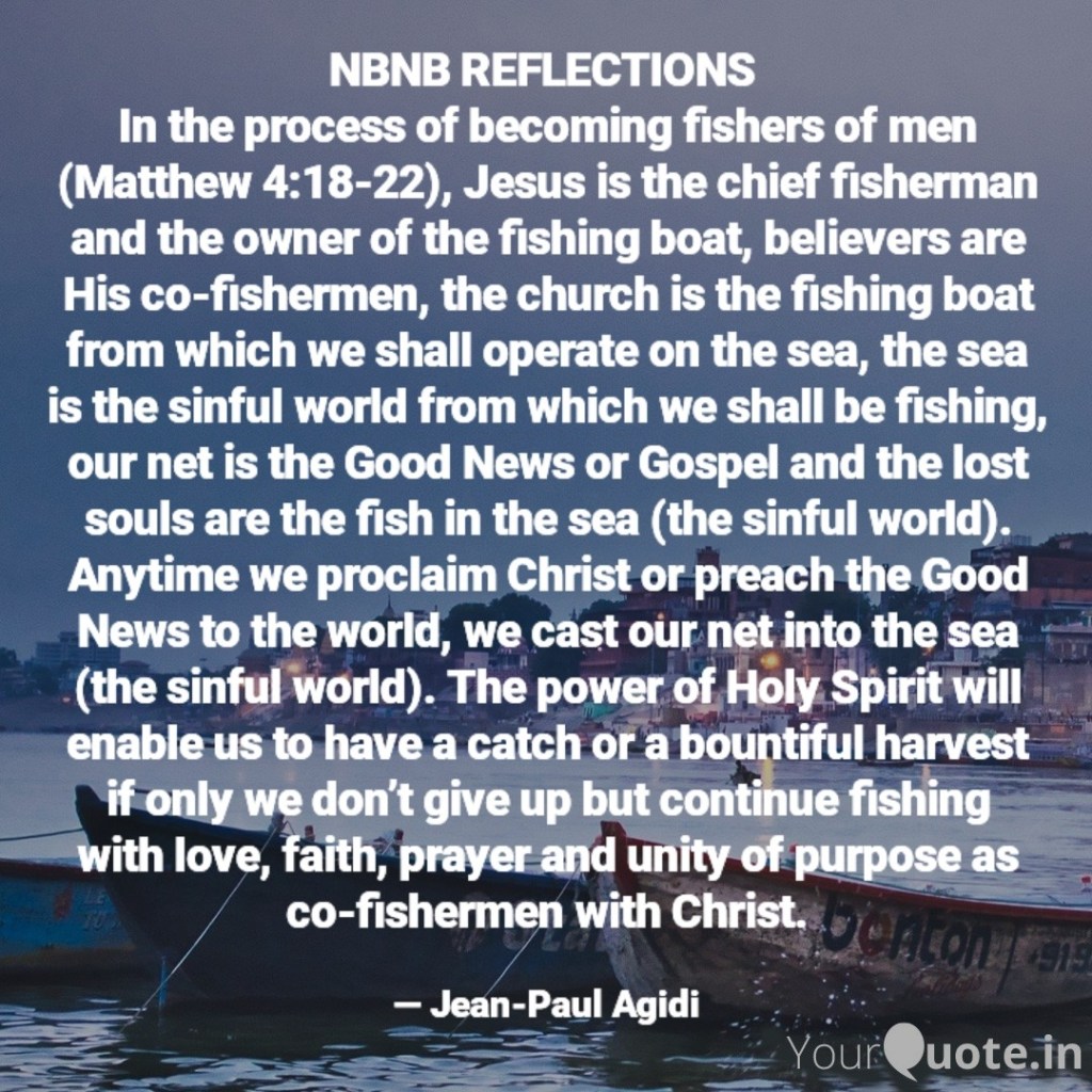 In fishing for the lost, Jesus is the chief fisherman, we believers are his co-fishermen, the church is the boat from which we shall operate on the sea, the sea is the sinful world from which we shall be fishing, our net is the Good News or Gospel and the lost souls are the fish in the sea of this sinful world. Anytime we proclaim Christ to the world or the Good News, we cast our net into the sea. The Holy Spirit will enable us to have a catch or a bountiful harvest if only we don’t give up but continue fishing with love, faith, prayer and the unity of purpose. Jesus has equipped us with a boat (the church), net (the Gospel) and Power (the Holy Spirit), It is now our turn to make ourselves available and cast the net of salvation for there are perishing fish in the sea of sin which we ought to save with urgency. We have no excuse, for we have also been saved by grace through faith in Christ. Shalom
