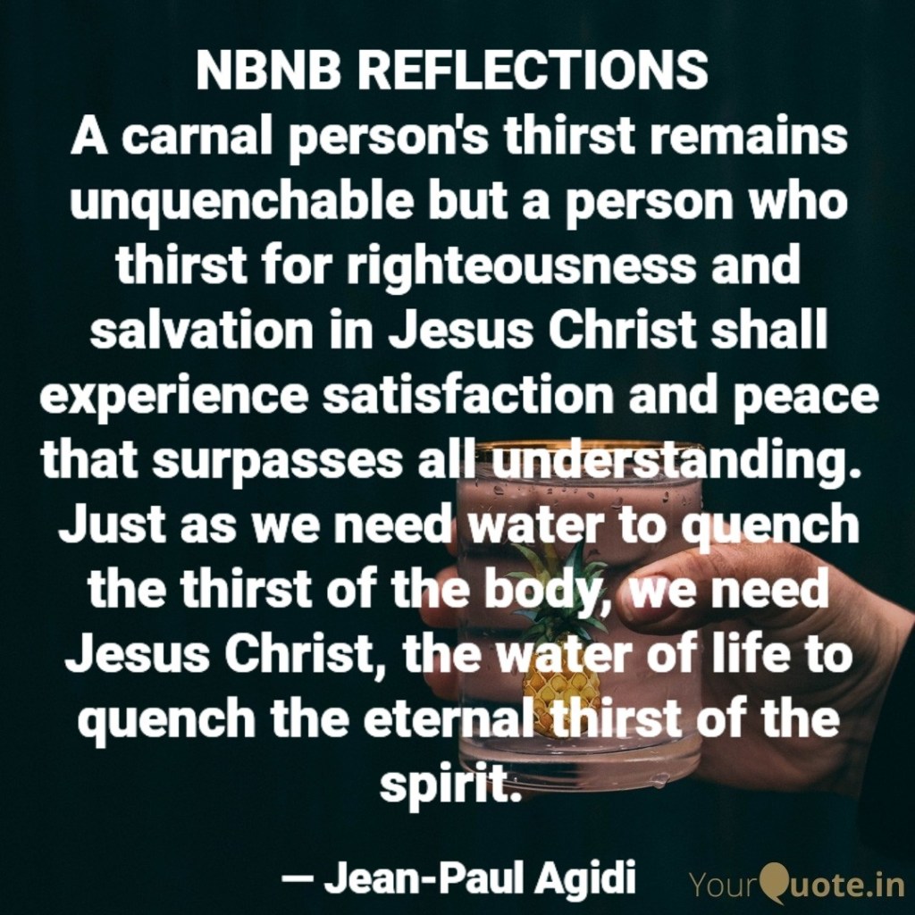 Dear friend in the Lord, without Christ in our lives, our righteousness and salvation are incomplete. Jesus assures us in Matthew 5:6 that “Blessed are those who hunger and thirst for righteousness, for they shall be satisfied.” For Jesus to become our righteousness and water of life that quenches our spiritual thirst eternally, we must make a conscious and deliberate decision or effort to invite Him into our lives and have a deeper relationship with Him. Jesus says “Behold, I stand at the door and knock. If anyone hears my voice and opens the door, I will come in to him and eat with him, and he with me. (Revelation 3:20). Jesus does not only eat with us but He quenches our thirst with the water of eternal life. Jesus Christ our water of life is available to all who are ready to repent, be baptised and make Jesus Christ their Lord and Savior. Once Jesus lives and reigns in our lives, we shall thirst no more, our spirits shall experience satisfaction and “…the peace of God, which surpasses all understanding…” (Philippians 4:7) Shalom.