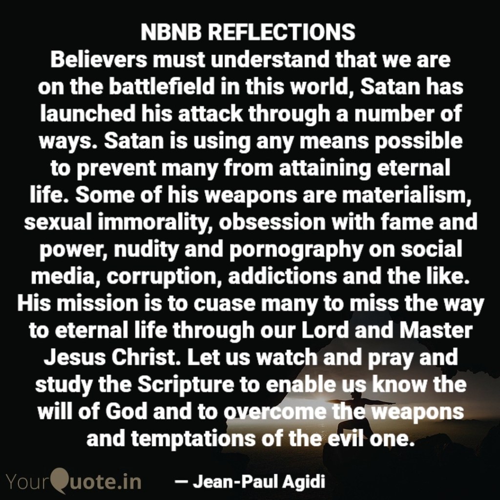 Dear friend, we are already on the battlefield in the world, Satan has launched his attack through a number of ways. Satan is using any mean possible to prevent many from attaining eternal life. Satan is using materialism, sexual immorality, obsession with fame and power, nudity and pornography on social media, corruption, addictions and the like to cuase many to miss the way to eternal life through our Lord and Master Jesus Christ. Let us watch and pray and study the Scripture to enable us know the will of God and to overcome the weapons and temptations of the evil one. Shalom