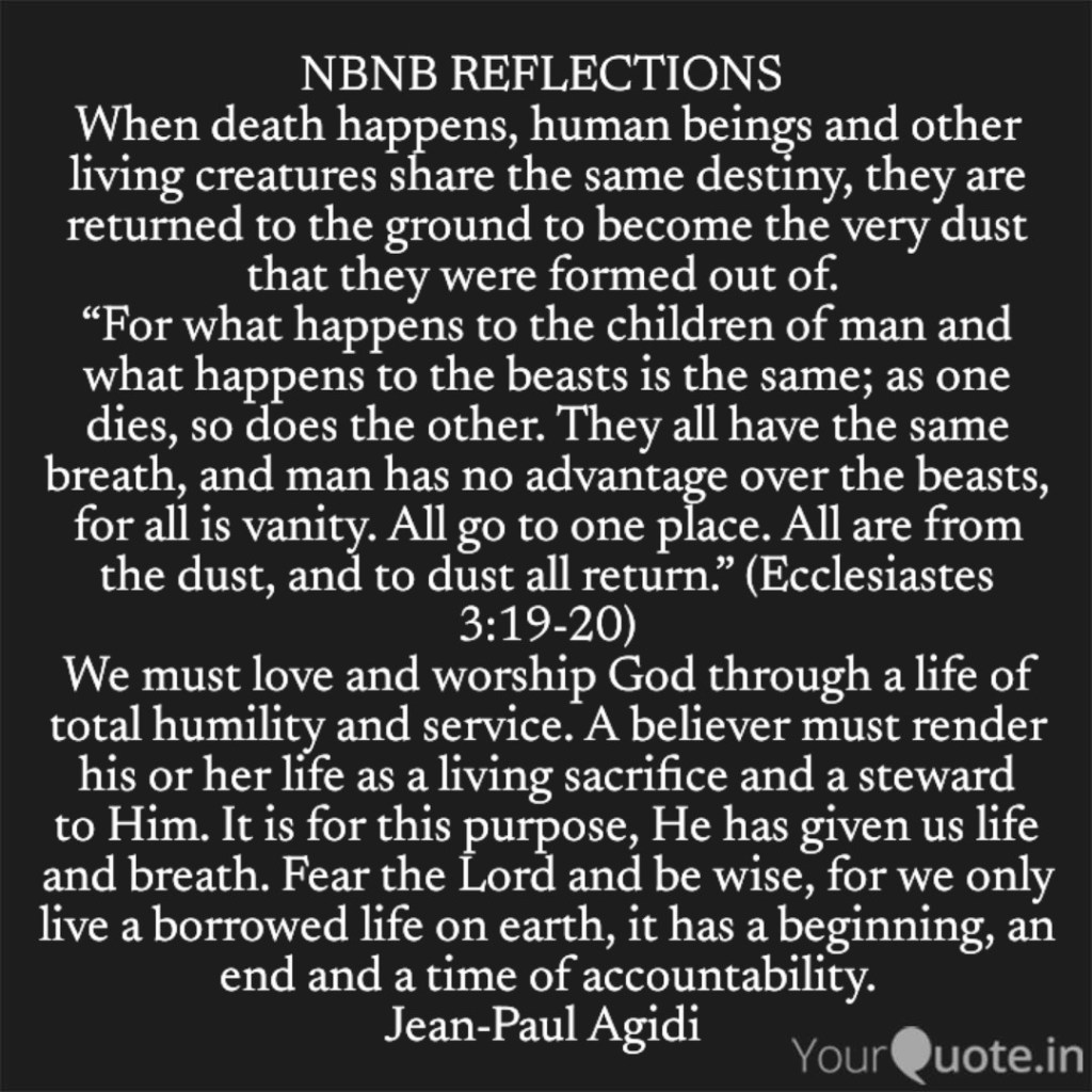 The key lesson of today’s reflection is that the life and breath of God in us are borrowed, therefore we are only stewards. Human beings and other living creatures through biological means can recreate their own but the mystery is that it takes God to give life and breath to their lifeless offsprings to be classified as living creatures. A time will surely come again for God to take back His life and breath, rendering that which was once a living creature lifeless, inactive and useless. The state of being lifeless, motionless, inactive and useless is what is described as death. When death happens, human beings and other living creatures share the same destiny, they are returned to the ground to become the very dust that they were formed out of. “For what happens to the children of man and what happens to the beasts is the same; as one dies, so does the other. They all have the same breath, and man has no advantage over the beasts, for all is vanity. All go to one place. All are from the dust, and to dust all return.” (Ecclesiastes 3:19-20)