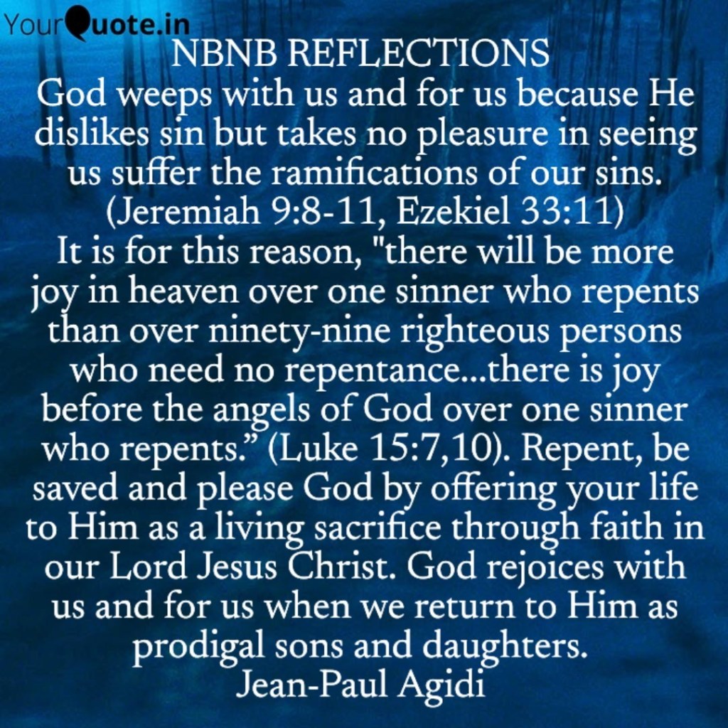 We would observe that God has a strong displeasure or dislike for sin and would punish the unrepentant and wicked, thus God says in Jeremiah 9:8-9 that “Their tongue is a deadly arrow; it speaks deceitfully; with his mouth each speaks peace to his neighbor, but in his heart he plans an ambush for him. Shall I not punish them for these things? declares the LORD, and shall I not avenge myself on a nation such as this?” It is however interesting to note that, in as much as God hates sin and a time will come where He will leave us with no choice but to punish evil doers, it hurts Him that human beings and nature would have to suffer the ramifications of sin or disobedience of humanity. It is for this reason God weeps with us and for us when we refuse to repent and have to suffer the consequences of our sins. “I will take up weeping and wailing for the mountains, and a lamentation for the pastures of the wilderness, because they are laid waste so that no one passes through, and the lowing of cattle is not heard; both the birds of the air and the beasts have fled and are gone. I will make Jerusalem a heap of ruins, a lair of jackals, and I will make the cities of Judah a desolation, without inhabitant.” (Jeremiah 9:9-11)