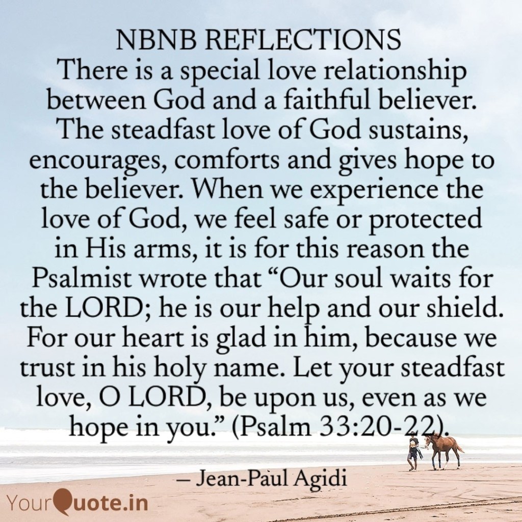 Dear friend there is a special or unique love relationship between God and a God-fearing and faithful believer. The love of God sustains, encourages, comforts and gives hope to the believer. When we experience the love of God, we feel safe or protected in His in arms or presence, it is for this reason the Psalmist wrote that “Our soul waits for the LORD; he is our help and our shield. For our heart is glad in him, because we trust in his holy name. Let your steadfast love, O LORD, be upon us, even as we hope in you.” (Psalm 33:20-22). We cannot experience the steadfast love of God if we allow sin to rule as and we trust in our own abilities instead of trusting in Him. Like the prodigal son, we cannot be beneficiaries of His steadfast love if we reject Him and move away from His love and protection. Again, like the prodigal son in Luke 15, we must always reflect on our relationship with God and if we discover that we have been wayward, disobedient or are lost we must immediately pray that “Father, I have sinned against heaven and before you. I am no longer worthy to be called your son (or daughter).’ (Luke 15:22). This prayer or declaration shows that we eagerly and earnestly seek the face of God to look with love upon us and not with wrath and judgement. Through God’s love we who are dead and are revived and we who were lost are found. (Luke 15:32). What is the current status of your relationship with God? Are you a beneficiary of His steadfast love through our Lord and Saviour Jesus Christ or you are far away in the wilderness of sin and disobedience? The choice is yours to make. Shalom.