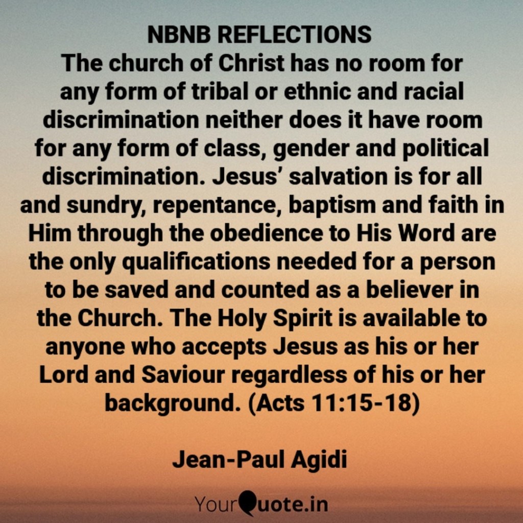 Beloved in the Lord, the church of Christ has no room for any form of tribal or ethnic and racial discrimination neither does it have room for any form of class, gender and political discrimination. Jesus’ salvation is for all and sundry, the only qualification is repentance, baptism and faith in Him. The Holy Spirit is available to anyone who accepts Jesus as his or her Lord and Saviour regardless of his or her background. It is for this reason, we are assured in Revelation 21:6 that “To the thirsty, I will give from the spring of the water of life without payment.” There is nothing indicating that a person thirsty for salvation must come from a particular ethnic group, class, gender or church denomination. For the purpose of emphasis, anyone regardless of his or her background who is thirsty for salvation will be welcomed and accepted by Jesus so long as the person is willing to come to Him. Paul again states unequivocally that “For as many of you as were baptized into Christ have put on Christ. There is neither Jew nor Greek, there is neither slave nor free, there is no male and female, for you are all one in Christ Jesus. (Galatians 3:27-28) Truly, Jesus welcomes all into the Church, we must be careful not to create any form of discriminatory impediment on the path of those who yearn to be saved and are willing to live a transformed life to the glory of God. Amen.