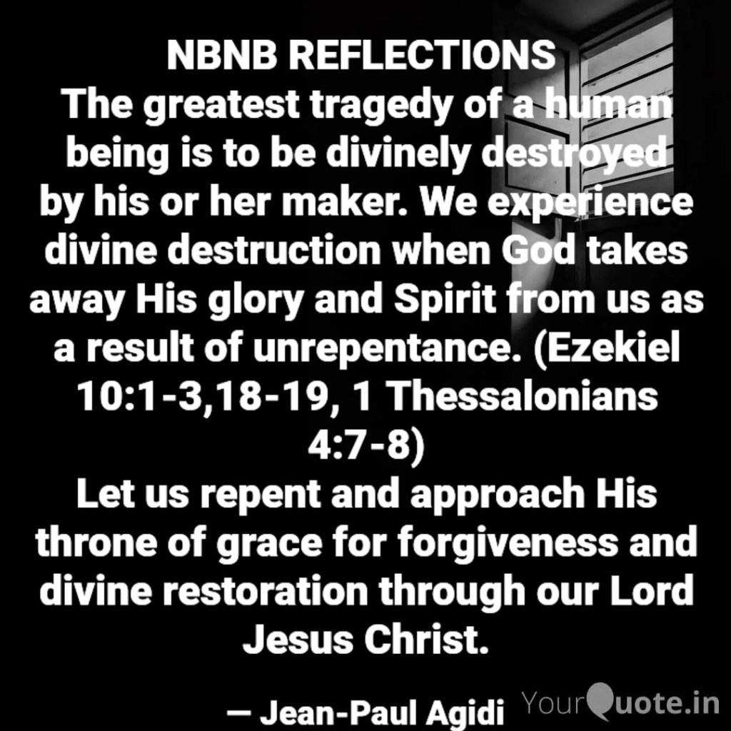 Divine destruction is the theme for our reflection. Destruction is the action or process of causing so much damage to something that it no longer exists or cannot be repaired. Divine destruction is damage caused by God when He takes away His glory or Spirit from us as a result of our unrepentance. Ezekiel narrated in today’s Scripture read his vision of God scattering burning coals over the city and taking away His Spirit and glory from the Temple which is the centre of spirituality or the divine place where the people of Israel experience the presence of God. “Then I looked, and behold, on the expanse that was over the heads of the cherubim there appeared above them something like a sapphire, in appearance like a throne. And he said to the man clothed in linen, “Go in among the whirling wheels underneath the cherubim. Fill your hands with burning coals from between the cherubim, and scatter them over the city…Then the glory of the LORD went out from the threshold of the house, and stood over the cherubim. And the cherubim lifted up their wings and mounted up from the earth before my eyes as they went out, with the wheels beside them. And they stood at the entrance of the east gate of the house of the LORD, and the glory of the God of Israel was over them.” (Ezekiel 10:1-3, 18-19). In other words, before Israel was physically destroyed by the Babylonian, Ezekiel witnessed divine destruction or the glory of the Lord taken away from Israel.