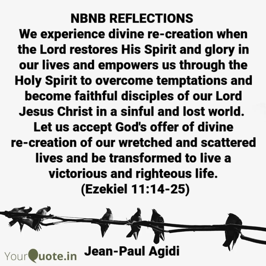 The theme for our reflection is Divine re-creation. Re-creation means to form anew. Divine re-recreation means God forming anew or build again that which has been destroyed. We shall recall in our previous reflection of Ezekiel Chapter 10 that God caused a divine destruction by taking away His Spirit and glory from Israel to render them vulnerable so that their enemies could besiege them and take them captives. Today hope is restored because what has been divinely destroyed would be divenely re-created. “…‘Thus says the Lord GOD: Though I removed them far off among the nations, and though I scattered them among the countries, yet I have been a sanctuary to them for a while in the countries where they have gone.’ Therefore say, ‘Thus says the Lord GOD: I will gather you from the peoples and assemble you out of the countries where you have been scattered, and I will give you the land of Israel.’ And when they come there, they will remove from it all its detestable things and all its abominations. And I will give them one heart, and a new spirit I will put within them. I will remove the heart of stone from their flesh and give them a heart of flesh, that they may walk in my statutes and keep my rules and obey them. And they shall be my people, and I will be their God. But as for those whose heart goes after their detestable things and their abominations, I will bring their deeds upon their own heads, declares the Lord GOD.” (Ezekiel 11:16-21). In other words, divine re-creation will take place when the Spirit of God or the glory of God is restored among the people.