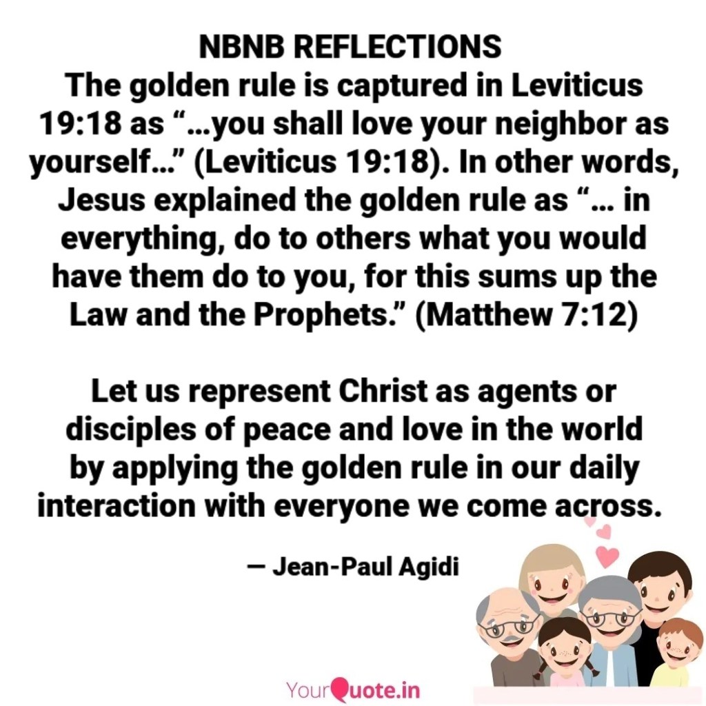 The theme for our reflection is the Golden rule. The golden rule is captured in Leviticus 19:18 as “…you shall love your neighbor as yourself…” (Leviticus 19:18). In other words, Jesus explained the golden rule as “… in everything, do to others what you would have them do to you, for this sums up the Law and the Prophets.” (Matthew 7:12)