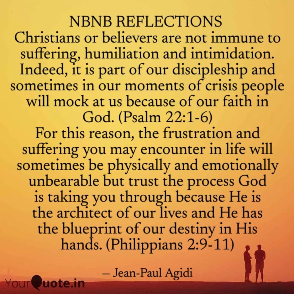 It is important to understand that Christians or believers are not immune to suffering and humiliation. Indeed it is part of our discipleship, there are times people will mock at us because of our faith in God, the Psalmist was also mocked at with these words “He trusts in the LORD; let him deliver him; let him rescue him, for he delights in him!” (Psalm 22:8). The most frustrating moment of your life is when you need your prayers answered urgently but your precarious situation lingers on and it feels like God is not even listening. Jesus felt the same way on the cross when He said “Eli, Eli, lema sabachthani?” that is, “My God, my God, why have you forsaken me?” (Matthew 27:26) but at the end He still trusted His Father and said “Father, into your hands I commit my spirit!” (Luke 23:46). Jesus knew the Father had a plan therefore even in suffering, humiliation and the feeling of rejection, He still trusted the Father and entrusted His Spirit into His hands. “Therefore God has highly exalted him and bestowed on him the name that is above every name, so that at the name of Jesus every knee should bow, in heaven and on earth and under the earth, and every tongue confess that Jesus Christ is Lord, to the glory of God the Father. (Philippians 2:9-11) Dear friend, the frustrations and suffering you may encounter in life will sometimes physically and emotionally be unbearable but remember our Lord Jesus’s example and trust the process because God is the architect of our lives and He has the blueprint of our destiny in His hands. Shalom.