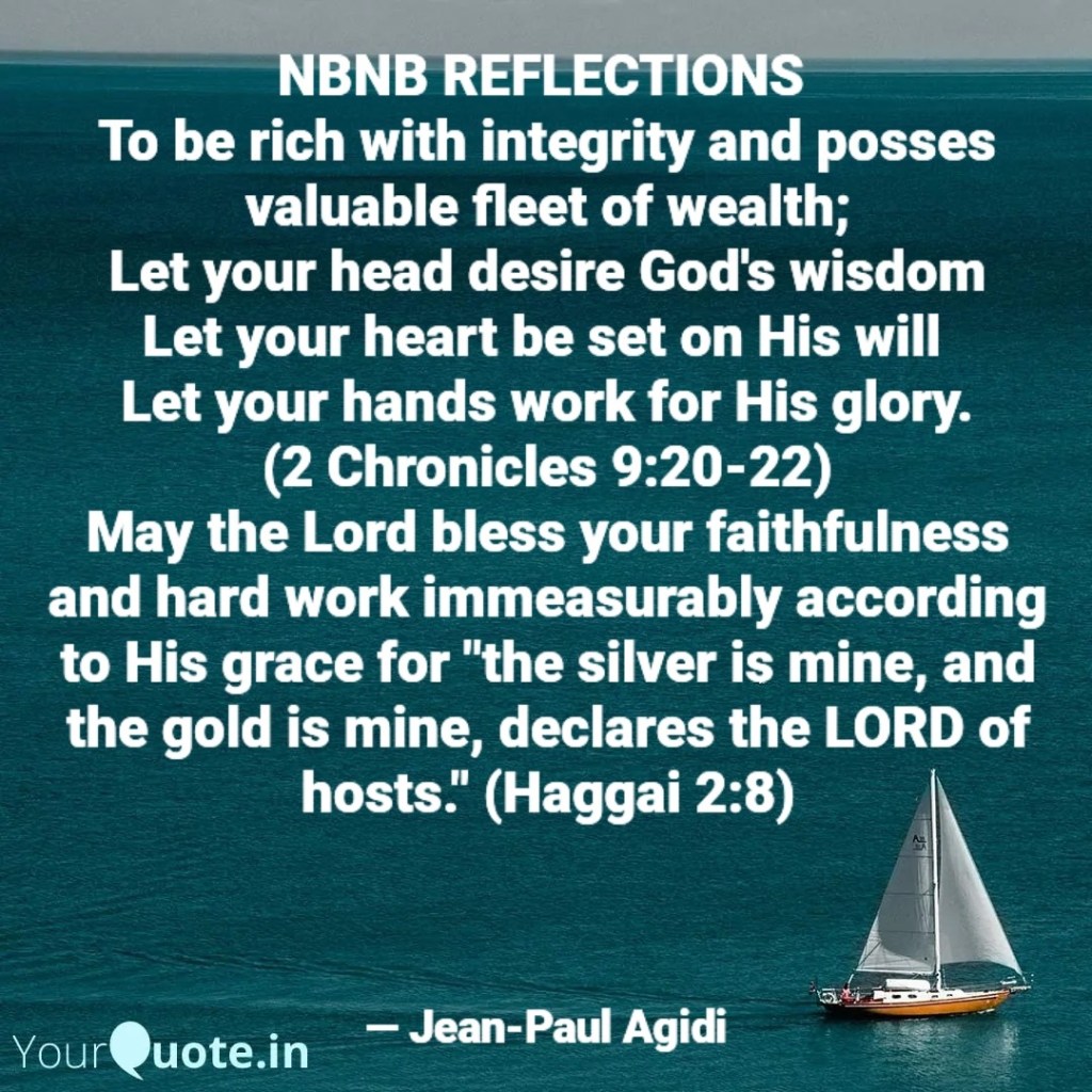 Dear friend, a person’s value or worth is determined by the sum total of His wealth. The sum total of a person’s value is ultimately determined by God’s grace. King Solomon was a beneficiary of God’s grace and blessing. He prayed for wisdom and the will of God to be done in His life to be able serve God’s people. God’s grace and glory was upon King Solomon and he was blessed greatly. Beloved in the Lord desire His will to be done in your life and at His own time you will possess valuable fleet to the glory of God. Haggai 2:8 assures us that “The silver is mine, and the gold is mine, declares the LORD of hosts. If you seek gold and silver in your fleet or life then like King Solomon, desire wisdom from God, work with your body and walk according to His will even when it becomes difficult to do so. In other words when, God blesses your head, heart and hands, you shall possess valuable fleets. King Solomon’ head was blessed with God’s wisdom, his heart loved God and his hands worked as a King and consequently, he was greatly was blessed by God. It is now your turn. Desire to be rich and be rich according to His grace. May you possess valuable fleet to His glory. Shalom