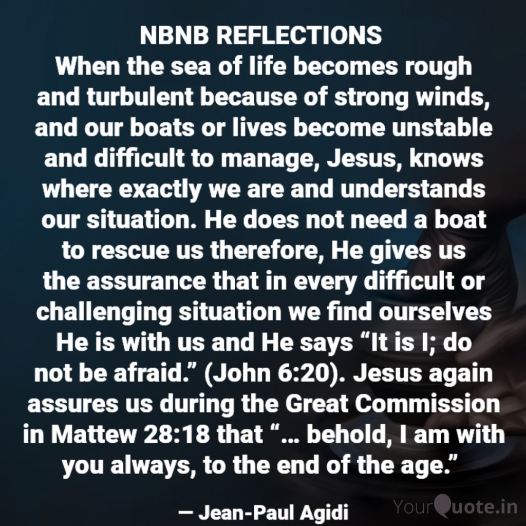 Dear friend in the Lord, the inspirational lesson for today’s reflection is that, we cannot journey alone in the boat of life while on the stormy and turbulent sea of life without our Lord Jesus Christ. We necessarily need a boat but the boat cannot guarantee our security or safety because it is always at the mercy of the sea and the storm. Regardless of the boat and its associated perils or challenges as a means of transport, it was probably the only way the disciples could get to Capernaum, however, Jesus’ journey to Capernaum was not dependent on the boat because He has the power to walk on the sea. Neither the sea nor the storm have power over Him, indeed He is the Lord of the sea and the storm. With this knowledge and assurance, we are greatly encouraged that we are not alone in the boat and the stormy sea of life. When the sea of life becomes rough and turbulent because of strong winds, and our boats or lives become unstable and difficult to manage, Jesus, knows where exactly we are and understands our situation. He does not need a boat to rescue us therefore He gives us the assurance that in every difficult or challenging situation we find ourselves He is with us and He says “It is I; do not be afraid.” (John 6:20). Jesus again assures us during the great Commission in Mattew 28:18 that “… behold, I am with you always, to the end of the age.”
