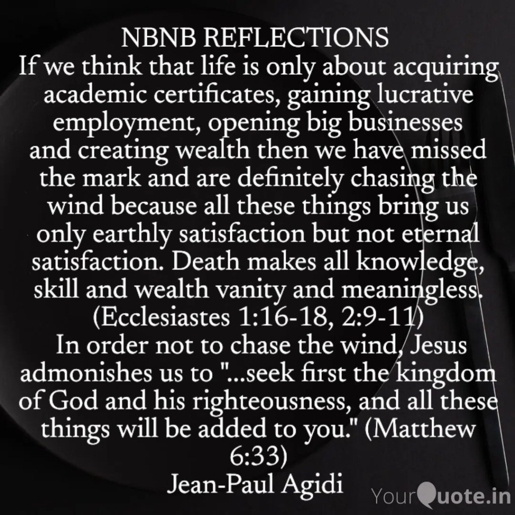 Dear friend, if we think that life is only about acquiring academic certificates, gaining lucrative employment, opening big businesses and creating wealth then we have missed the mark and are definitely chasing the wind because all these things bring us only earthly satisfaction but not eternal satisfaction. Death makes all knowledge, skill and wealth vanity and meaningless. Job turns our attention to the most important pursuit in life when he said “Naked I came from my mother’s womb, and naked shall I return. The LORD gave, and the LORD has taken away; blessed be the name of the LORD.”(Job 1:21). In others words, our relationship with God is what makes life worth living on earth because He is our creator and sustainer. We are to enjoy the fruits of our labour and skill but most importantly we must have an eternal relationship with God, for this reason, Paul concluded that “For if we live, we live to the Lord, and if we die, we die to the Lord. So then, whether we live or whether we die, we are the Lord’s.” (Romans 14:8). In order not chase the wind, Jesus ultimately admonishes us to“…seek first the kingdom of God and his righteousness, and all these things will be added to you.” (Matthew 6:33). Shalom.