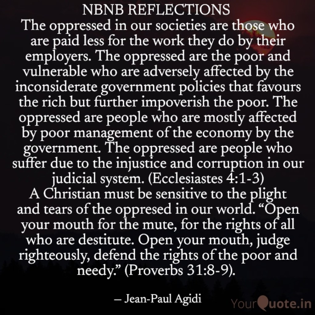 The question is, who are the oppressed in our societies today? The oppressed in our societies are those who are paid less for the work they do. The oppressed are the poor and vulnerable who are mostly affected by the inconsiderate government policies that favours the rich but further impoverish the poor. The oppressed are people are mostly affected by the poor management of the economy by the government. The oppressed are people who suffer due to the injustice in our judicial system. Christians must be the voice of the voiceless and hope for the oppressed in the environment of injustice, inequality and unfair distribution of wealth. Christians must preach about social justice to correct the wrongs in our societies against the oppressed and even go a step further to speak truth to power on issues of gender based violence, racial injustice and the dignity of all persons regardless of their religion, political affiliation or tribe. Jesus’ earthy ministry was centered on setting the oppressed free, it is for this reason, He said “The Spirit of the Lord is upon me, because he has anointed me to proclaim good news to the poor. He has sent me to proclaim liberty to the captives and recovering of sight to the blind, to set at liberty those who are oppressed, to proclaim the year of the Lord’s favor.” (Luke 4:18-19) Dear friend, as a believer be sensitive to the plight and tears of the oppresed and “Open your mouth for the mute, for the rights of all who are destitute. “Open your mouth, judge righteously, defend the rights of the poor and needy.” (Proverbs 31:8-9). Shalom.