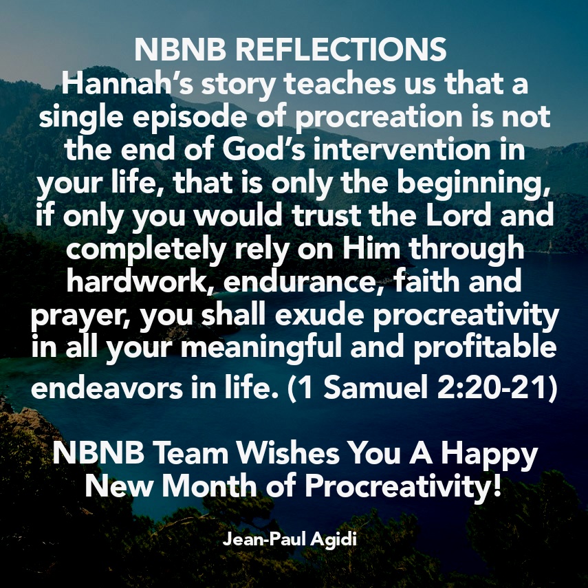 Dear friend, in the Lord Hannah was once upon a time barren but God intervened through fervent and ceaseless prayer. Hannah procreated and gave birth to Samuel who she and the husband vowed to give to the Lord as a living sacrifice. Hannah did not stop praying because she had Samuel, she continued to pray for more children because she served the Lord of abundance and the Lord of the harvest who through Jesus Christ assured us that “Ask, and it will be given to you; seek, and you will find; knock, and it will be opened to you. For everyone who asks receives, and the one who seeks finds, and to the one who knocks it will be opened.” (Matthew 7:7-8). Dear friend, Hannah “prayed without ceasing” as Paul will greatly encourage us to do in 1 Thessalonians 5:17, Hannah moved from an episode of procreation to an awesome state of procreativity where she became a mother of five children in addition to Samuel. Certainly, “With man it is impossible, but not with God. For all things are possible with God.” (Mark 10:27). Hannah’s story teaches us that a single episode of procreation is not the end of God’s intervention in your life, that is only the beginning, if only you would trust the Lord and completely rely on His will for your life through hardwork, endurance, faith and prayer, you shall exude procreativity in your business, marriage, academics and all your profitable and meaningful endeavors in life. Indeed, you shall experience a state of exponential and overwhelming blessings. Shalom.
