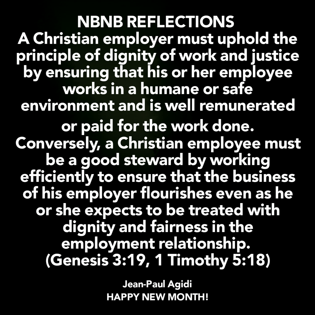 Dear friend, God established the nexus between work and wages when He told Adam that he must eat bread out of his sweat. The dignity of work and justice is that “…You shall not muzzle an ox when it treads out the grain,” and, “The laborer deserves his wages.” (1 Timothy 5:18). A Christian employer must uphold the principle of dignity of work and justice by ensuring that his or her employee work under humane or safe conditions and is well remunerated or paid for the work done. Paul again underscores the importance of the dignity of work and justice when he admonished the Thessalonians that “…If anyone is not willing to work, let him not eat.” (2 Thessalonians 3:10). The sad reality is that many people are working hard yet they are not eating and living well because they are being underpaid. It is our duty as Christians to be the voice of the voiceless in the world of work even as we advocate for the dignity of work and justice for all. Employees must also understand the relationship between productivity and dignity of work and justice. A Christian employee must be a good steward by working hard to ensure that the business of his employer flourishes even as he or she expects to be treated with dignity and fairness in terms of wages and good conditions of service. As the worker works hard, his or her bread must be worth his or her sweat. Shalom.
