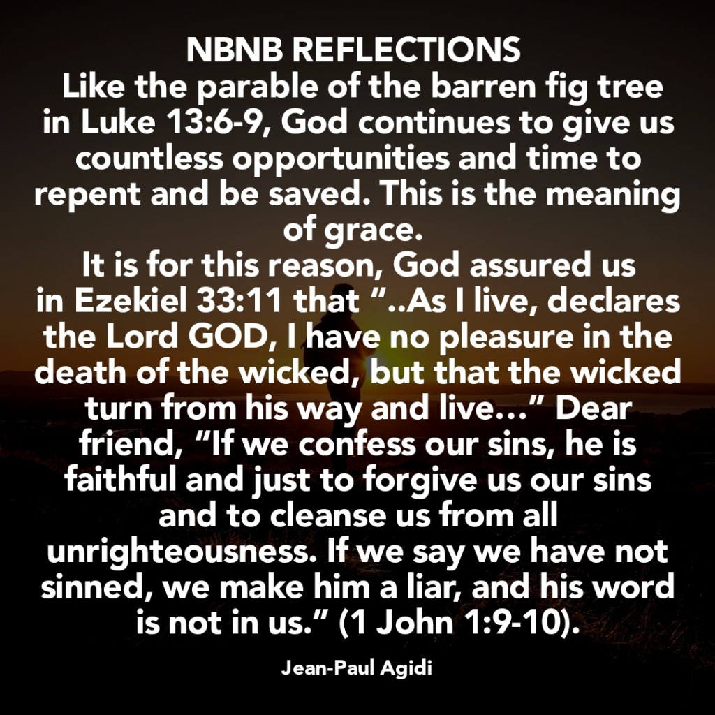 The good news is that like the parable of the barren fig tree in Luke 13:6-9, God continues to give us countless opportunities and time to repent and be saved. This is the meaning of grace. It is for this reason, God assured us in Ezekiel 33:11 that “Say to them, As I live, declares the Lord GOD, I have no pleasure in the death of the wicked, but that the wicked turn from his way and live…” Beloved in the Lord, “If we confess our sins, he is faithful and just to forgive us our sins and to cleanse us from all unrighteousness. If we say we have not sinned, we make him a liar, and his word is not in us.” (1 John 1:9-10). Repentance is however a choice but like the prodigal son, let us always repent and say “Father, I have sinned against heaven and before you. I am no longer worthy to be called your son.”(Luke 15:21). Through genuine repentance we recieve forgiveness and salvation through our Lord Jesus, “For God so loved the world, that he gave his only Son, that whoever believes in him should not perish but have eternal life. For God did not send his Son into the world to condemn the world, but in order that the world might be saved through him.” (John 3:16-17)