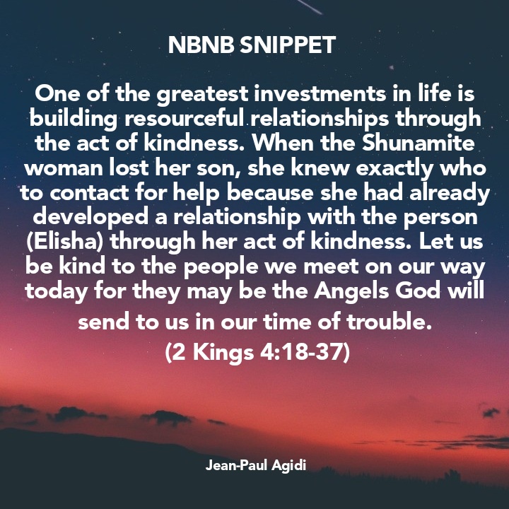 Dear friend, one of the greatest investments in life is building resourceful relationships through the act of kindness. Had the Shunamite woman refused to be kind to the Prophet Elisha, could she have boldly gone to him for help? When her son died, she knew exactly who to contact for help because had developed a relationship with the person (Propet Elisha) through her act of kindness. “she called to her husband and said, “Send me one of the servants and one of the donkeys, that I may quickly go to the man of God and come back again.” And he said, “Why will you go to him today? It is neither new moon nor Sabbath.” She said, “All is well.” Then she saddled the donkey, and she said to her servant, “Urge the animal on; do not slacken the pace for me unless I tell you.” So she set out and came to the man of God at Mount Carmel. 2 Kings 4:22-25. What kind of relationship are you investing in today and what sort of dividends will it yield for you soon? In Genesis 18:1-19, Abraham was kind and hospitable to some strangers who were passing by his tent and it later turn out that these were Angels who brought him and his wife Sarah the good news of having their own son a year later. Let us be kind to the people we meet on our way today for they may be the Angels God will send to us in our time of trouble. Shalom.