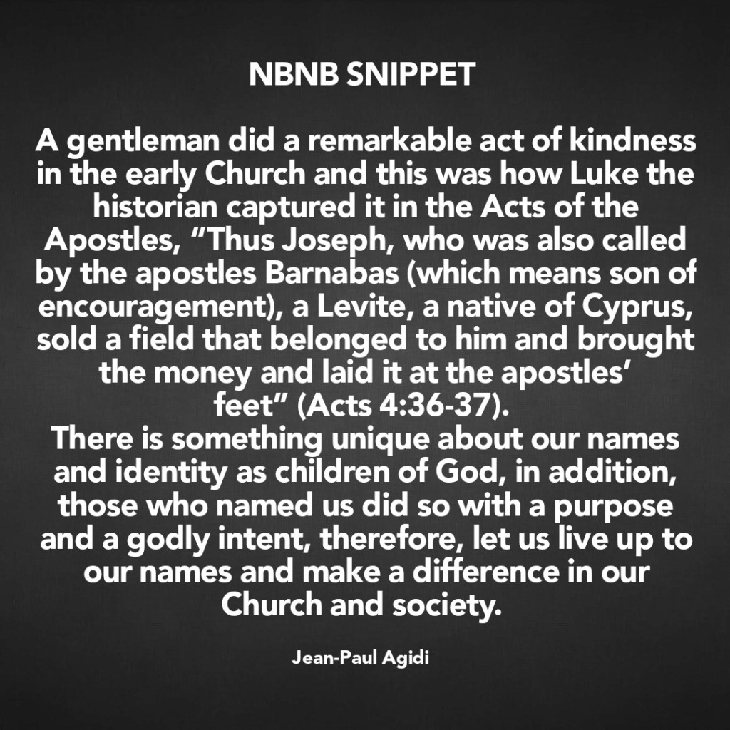 A gentleman did a remarkable act of kindness in the early Church and this was how Luke the historian captured it in the Acts of the Apostles, “Thus Joseph, who was also called by the apostles Barnabas (which means son of encouragement), a Levite, a native of Cyprus, sold a field that belonged to him and brought the money and laid it at the apostles’ feet” (Acts 4:36-37). In other words, his name Barnabas which meant son of encouragement brought great encouragement to the Church of Christ when he supported the mission of God through a colossal donation. He truly lived up to what is in his name and was relevant to his time.