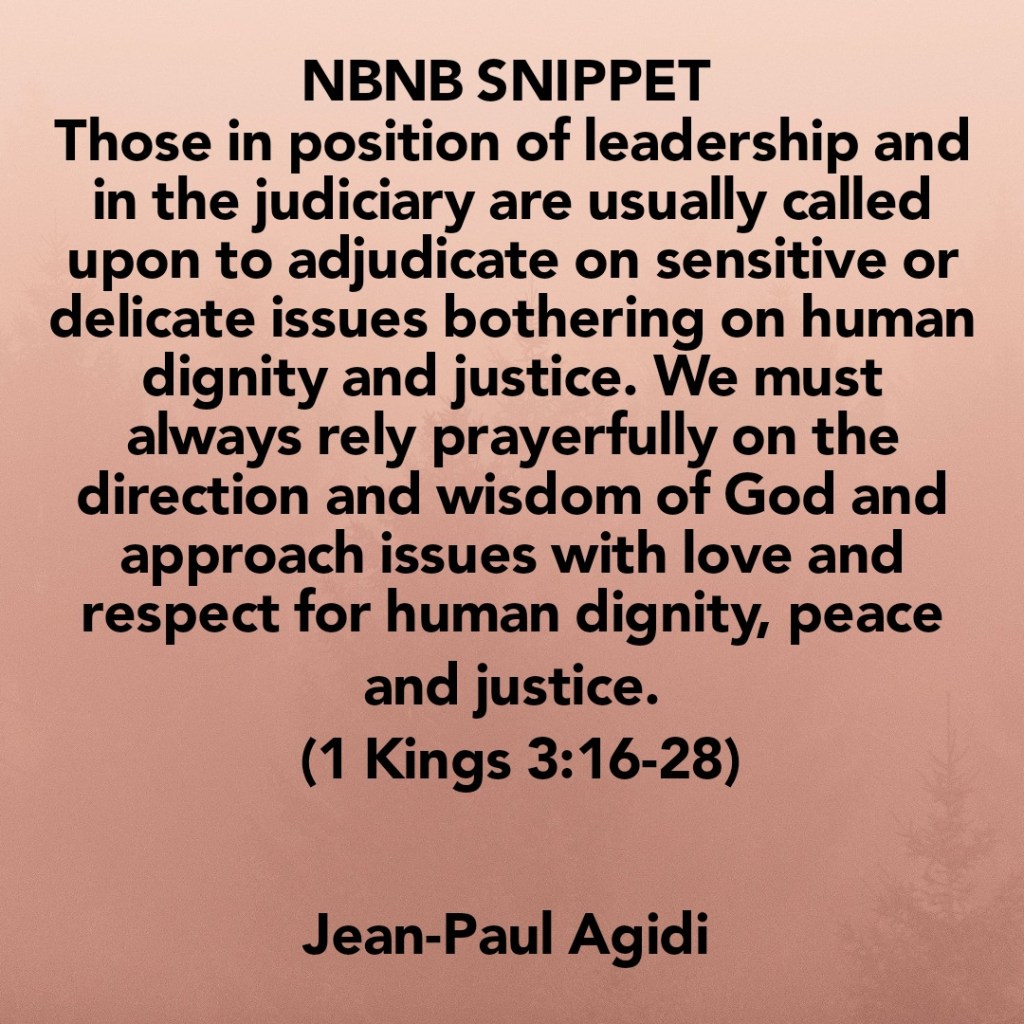 To resolve the above issue, King Solomon attempted to harm the baby by having him split into two and shared among them but the true mother demonstrated emotional commitment and love for the her son. “Then the woman whose son was alive said to the king, because her heart yearned for her son, “Oh, my lord, give her the living child, and by no means put him to death.” But the other said, “He shall be neither mine nor yours; divide him.” Then the king answered, “Give the living child to the first woman, and by no means put him to death; she is his mother.” (1 kings 3:26-27). In other words, the wise ruling of King Solomon led to the discovery of the true mother of the child, respect and preservation of human dignity and justice. The second woman’s lack of emotional commitment to the baby and false claim was exposed through King Solomon’s wise approach and ruling in the above delicate case. At the end of the day his wise ruling was based on love and through love justice was served. Those in position of leadership and in the judiciary are usually called upon to adjudicate on sensitive or delicate issues bothering on human dignity and justice. We must always rely prayerfully on the direction and wisdom of God and approach issues with love and respect for human dignity, peace and justice. A good tool to help us make wise decisions in life is the Scripture or the Word of God. We shall be endowed with godly wisdom to make discerning decisions if we continually feed on His Word. Shalom