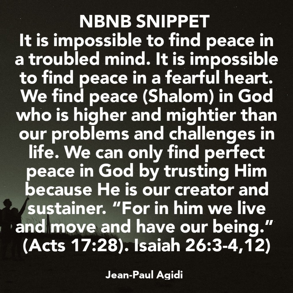 Dear friend, we all seek peace which is the totality of our well-being. Many of us toil day and night for our daily bread and for the other basic necessities of life. During a period of economic recession and a high rise in unemployment, how can one find peace? In an era where prices of fuel, goods and services keep increasing exponentially, how can one experience peace? Can a believer find peace when his or her enemies are determined to destroy him or her or always scheming to cause harm to him or her? Beloved in the Lord, the more we try to navigate the aforementioned situations of life the more disturbed, depressed and frustrated we become. It is impossible to find peace in an already troubled mind and it is impossible to find peace in a fearful heart. We can only find peace in a power higher and a person mightier than our problems and challenges in life. We can only find peace in the one who created us, “For in him we live and move and have our being.” (Acts 17:28), Jesus, knowing the kind of peace we yearn for cannot be experienced or given by mere mortals, assured us that “Peace I leave with you; my peace I give you. I do not give to you as the world gives. Do not let your hearts be troubled and do not be afraid. (John 14:27). It is for this reason Isaiah assures us that “You(God) keep him in perfect peace whose mind is stayed on you because he trusts in you. (Isaiah 26:3) In other words, to fully experience the peace of God amid the turbulence and challenges of life we need to trust Him every step of the way. Prayer and knowledge of His Word are inevitable in deepening and sustaining our trust in the Lord to continually experience His peace. There are many Christians who desire the peace of God yet they are constantly living in anxiety and do not have time to go to God in prayer and to strengthen their faith by reading and studying His Word. How can you experience the peace of God if you do not believe in the efficacy of prayer and the Word of God? How can you experience the peace of God and smile at the storm if you are unable to put your trust in the Lord? May the Holy Spirit strengthen our faith to enable us experience the peace of our Lord Jesus Christ. Shalom.