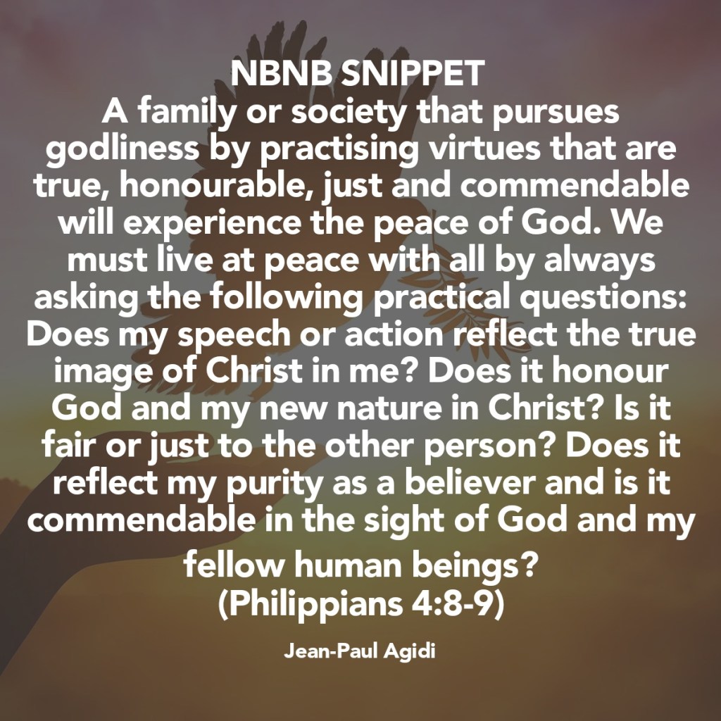 Dear friend in the Lord if we desire the peace of God in our lives then we must not only be hearers of the Word but be doers of the Word. We must practice what we preach and learn from the Scripture. Paul understands that for harmony to exist among Christians and for the peace of God to be felt, we, first of all, fill our minds with that which is true, honourable, just, pure, lovely and commendable. Secondly, when our minds are filled with godly virtues which are the same virtues found in Paul since he became a believer and an Apostle of Christ, we practice these virtues! We must do or practice what is true, honourable, just, pure lovely and commendable as a manifestation of our faith and transformation in Jesus Christ. Indeed, a society that pursues godliness by practising virtues that are true, honourable, just and commendable will experience the peace of God. It is important to mention that Paul is not asking Philippian Christians to merely copy his human nature or behaviour but he invites them to practice and live by the image of Christ that is manifesting in His life. It is for this purpose Paul wrote that “I have been crucified with Christ. It is no longer I who live, but Christ who lives in me. And the life I now live in the flesh I live by faith in the Son of God, who loved me and gave himself for me.” (Galatians 2:20). Truly, it is only in Christ that we find that which is true, honourable, just, pure, lovely and commendable. Beloved in the Lord, if we wish to experience the God of peace and live at peace with all then we must endeavour to possess the Christ-like virtues of practising whatever is true in the Gospel, honourable of a believer, just in all circumstances, pure in the sight of God and commendable by both believers and unbelievers. We must live at peace with all in our homes, at our churches, in our relationships and societies by always asking the following practical questions: Does my speech or action reflect the true nature of Christ in me? Does it honour God and my new nature in Christ? Is it fair or just to the other person? Does it reflect my purity as a believer and is it commendable in the sight of others? Shalom.