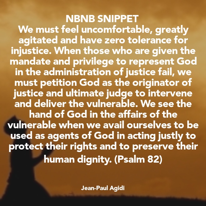 The psalmist confronts God on behalf of the weak, fatherless, afflicted and destitute when he said “Arise, O God, judge the earth; for you shall inherit all the nations! (Psalms 82:8) Dear friend in the Lord, we must feel uncomfortable, greatly agitated and have zero tolerance for injustice. When those who are given the mandate and privilege to represent God in the administration of justice fail, we must petition God as the originator of justice and ultimate judge to intervene and deliver the vulnerable. We see the hand of God in the affairs of the vulnerable when we avail ourselves to be used as agents of God in acting justly to protect their rights and to preserve their human dignity. Shalom.