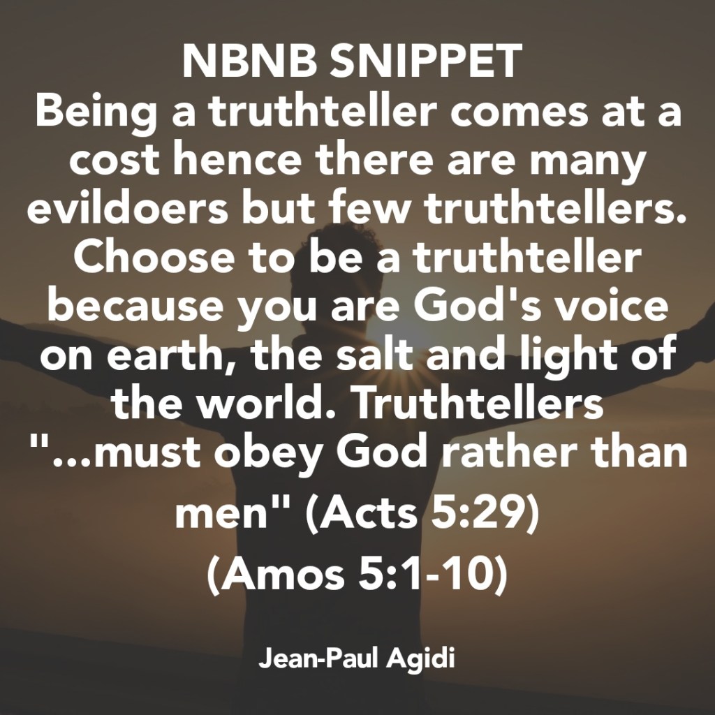 Beloved in the Lord, it is however unusual for the truthteller to be in the good books of evildoers and nation wreckers. Those who benefit and profit from injustice and corruption abhor or regard the truthteller with disgust and hatred to the point that they plot his or her death. This was the fate of Jeremiah, Elijah, John the Baptist, the Apostles and ultimately Jesus Christ our Lord, except that He resurrected on the third day after His suffering and crucifixion. Due to the cost of being a truthteller, we have many evildoers but few truthtellers. To be a truthteller, you must be ready for persecution, insults, spiritual and physical attacks, indeed it comes at a great cost but Jesus gives us the assurance that “Blessed are those who are persecuted for righteousness sake, for theirs is the kingdom of heaven. “Blessed are you when others revile you and persecute you and utter all kinds of evil against you falsely on my account. Rejoice and be glad, for your reward is great in heaven, for so they persecuted the prophets who were before you. (Matthew 5:10-12) Dear friend, we find ourselves in an era where corruption, murder, immorality and all manner of evil have engulfed our nation, Christians must be truthtellers regardless of the cost. We must be truthtellers because “You are the salt of the earth…” and “You are the light of the world…” Matthew 5:13-14). Be bold and do not be afraid to execute your mandate as a believer and a truthteller at your office, in your family, in your church, in the public vehicle and in any gathering where you have the opportunity to address people. Peter admonishes us that “We must obey God rather than men” (Acts 5:29). Shalom
