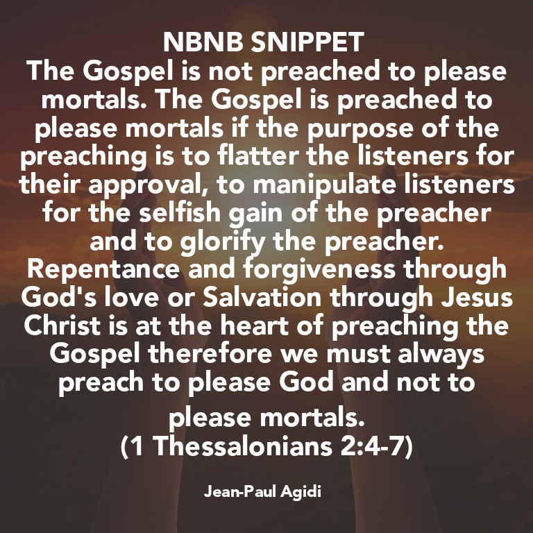 - Some preach the Gospel to please people for their selfish gains or profit. Paul again made it clear to the Thessalonians that they did not preach “… with a pretext for greed…” (1 Thessalonians 2:5). Jesus admonishes us to “…proclaim as you go, saying, The kingdom of heaven is at hand.’ Heal the sick, raise the dead, cleanse lepers, cast out demons. You received without paying; give without pay. Acquire no gold or silver or copper for your belts, no bag for your journey, or two tunics or sandals or a staff, for the labourer deserves his food.” (Matthew 10:7-10) In other words, if we faithfully proclaim the Gospel without pleasing mortals but to please God, He “will supply every need of yours according to his riches in glory in Christ Jesus.” (Philippians 4:19)