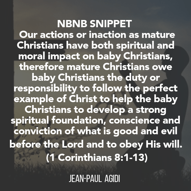 In the twenty-first century Church, apart from issues of idol worship in Africa and other places in the world, there are equally important issues of drunkenness and illicit drugs consumption or addiction, pornography, nudity and other issues of morality that Christians are faced with. As Christian parents, what kind of movies do we watch and songs do you listen to at home, what kind of drinks do we consume at home, what kind of conversation do we engage in with others to the hearing of our children? Do we reflect on our actions and inactions and their impacts on our children’s spirituality and morality before taking decisions? As Christian leaders, what are our views on drunkenness, sexuality, politics, corruption and other issues that the world is in a dilemma about? Always remember that Christian leaders and other mature Christians must guide baby Christians of all generations in understanding and living by the teachings of Scripture. Paul further admonishes us that “I have the right to do anything,” you say—but not everything is beneficial. “I have the right to do anything”—but not everything is constructive. No one should seek their own good, but the good of others. (1 Corinthians 10:23-24) We further weaken the conscience of baby Christians and consequently enable them to go wayward when we condone or do not take up the responsibility of condemning or taking resolute decisions on issues that poses moral or spiritual dilemma or challenges in the minds of baby Christians. Dear friend, what kind of Christian are you? If you believe that you are a mature Christian then continue to live by the perfect example of Christ and by the guidance of Scripture and the Holy Spirit but if you are a baby Christian then choose a good and a worth emulating mature Christian who will have a positive impact on your spiritual growth as Paul did to many whom he preached and shepherded. No Bible No Break is one of the tools or resources for both mature and baby Christians to enable us continually grow and navigate through the myriads of spiritual and moral issues that face us in the world today. Shalom.