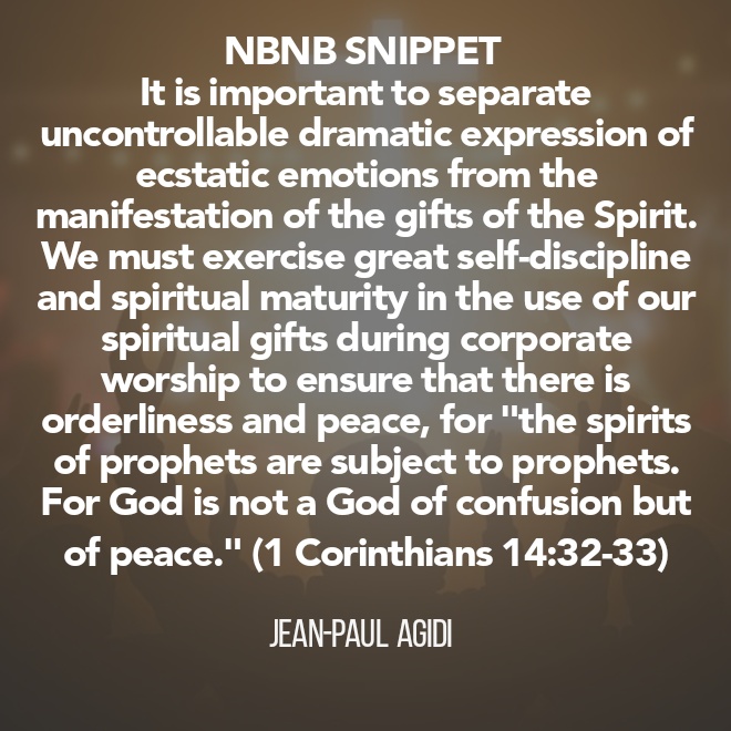 Dear friend in the Lord, in corporate worship there must be order in the exercise of our spiritual gifts, there is no excuse for a believer to say that he or she has no control over the manifestation of the Holy Spirit in him or her. It is disorderly for preaching to be ongoing while someone all of a sudden begins to speak tongues so loud that it interrupts the hearing of the Word of God. It is chaotic, when two or three people purport to give a revelation and they all shout and proclaim the message they have at the same time. Who do we listen to and who do we take directions from? It is important to separate ecstatic emotions from the manifestation of the gifts of the Spirit even as we exercise great self-discipline and spiritual maturity during corporate worship to ensure that there is orderliness and peace. Some churches have encouraged chaos at corporate worship services to the extent that it has become the normal way of worship. Members of such churches hardly hear the voice of God and sound teaching for their edification and encouragement. For the voice of God to be heard in corporate worship there must be orderliness and a peaceful atmosphere. Let us remember that “the spirits of prophets are subject to prophets. For God is not a God of confusion but of peace.” (1 Corinthians 14:32-33) In other words, we do not lose our consciousness, sanity and senses when exercising the gifts of the Spirit therefore we must put great emphasis on orderliness and making peace during corporate worship. Shalom.