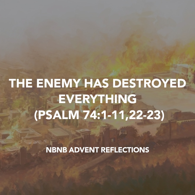 The enemy has destroyed everything is the theme for our reflection. The Psalmist laments to the Lord and calls upon Him to avenge the destruction of the temple and sacred place of worship by the enemy. This was probably the time of the Babylonian empire when they destroyed the temple. The Psalmist is heartbroken that the dwelling place of the Lord has been destroyed yet the Lord seem to be slow in dealing with the perpetrators. “How long, O God, is the foe to scoff? Is the enemy to revile your name forever? Why do you hold back your hand, your right hand? Take it from the fold of your garment and destroy them! (Psalms 74:10-11)