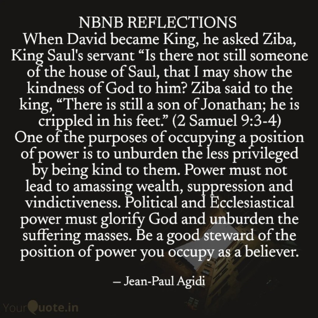 When we occupy positions of power or political offices there is the temptation to amass wealth and become vindictive. Some people amass so much wealth to the extent that they do injustice to the poor by taking away the little that belongs to them. If you become powerful let the fear of God and the love of God guide you in your relationship with your subjects or subordinates. King David was not power-drunk and selfish but he was filled with God’s Spirit and kindness, therefore “When Mephibosheth son of Jonathan, the son of Saul, came to David, he bowed down to pay him honour. David said, “Mephibosheth!” “At your service,” he replied. “Don’t be afraid,” David said to him, “for I will surely show you kindness for the sake of your father Jonathan. I will restore to you all the land that belonged to your grandfather Saul, and you will always eat at my table. ” (2 Samuel 9:6-7). My dear friend, be a Christian politician, king, or boss with a difference. Show God’s kindness to all and sundry including your enemies or opponents for that is the will of God. The greatest act of kindness God showed to humanity is ” For God so loved the world that he gave his one and only Son, that whoever believes in him shall not perish but have eternal life.” (John 3:16). Jesus again teaches us the meaning of God’s kindness when He said that “But to you who are listening I say: Love your enemies, do good to those who hate you, bless those who curse you, pray for those who mistreat you. (Luke 6:27-28). The greatest human action that can transform the world and make it a peaceful place is not war and political superiority but the unconditional love and kindness of God as seen in Jesus Christ. Christians must be the light of the world by showing in our daily interaction with people that we possess God’s kindness which is devoid of ethnocentrism, racism and other forms of divisive barriers in the world. Shalom