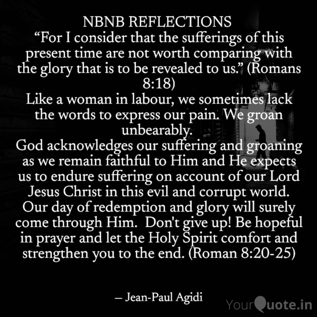 Beloved in the Lord, we need to be patient in enduring suffering on account of our faith in the Lord Jesus Christ. The Resurrection, Ascension and promise of the return of our Lord Jesus Christ must continue to sustain our hope. No matter the struggle and temptations we go through, it will end in our salvation and glory just like a woman endures pains during childbirth but as soon the child is delivered, the joy she feels overcome the pain she felt. Paul, puts it this way, “For I consider that the sufferings of this present time are not worth comparing with the glory that is to be revealed to us.” (Romans 8:18). Don’t give up my dear friend in suffering for Christ, your redemption and glory is bigger than your tribulation. Your redemption and glory are everlasting and will surely come. Shalom.
