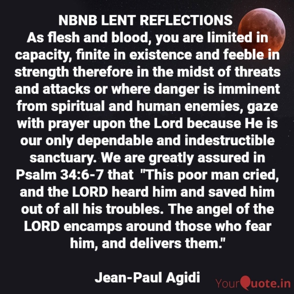 The psalmist who was believed to be David found God to be his sanctuary therefore he proclaimed, “This poor man cried, and the LORD heard him and saved him out of all his troubles. The angel of the LORD encamps around those who fear him, and delivers them.” (Psalm 34:6-7). Dear friend in the Lord, we are limited in our capacity, finite in existence and feeble in strength; therefore in the midst of threats and attacks or where danger is imminent from human or spiritual enemies, gaze with prayer upon the Lord. The Lord is our only dependable and indestructible sanctuary. It is for this reason we are again assured in Psalm 91:7-10 that “A thousand may fall at your side, ten thousand at your right hand, but it will not come near you. You will only look with your eyes and see the recompense of the wicked. Because you have made the LORD your dwelling place— the Most High, who is my refuge— no evil shall be allowed to befall you, no plague will come near your tent.”