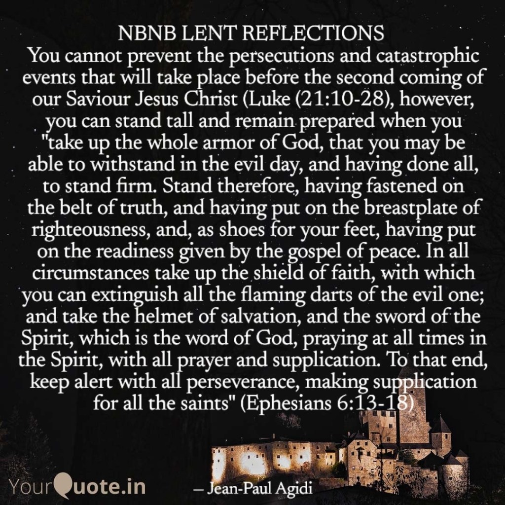 It is important to note that to remain prepared and be able to stand tall to meet the Lord on His day, we must “…take up the whole armor of God, that you may be able to withstand in the evil day, and having done all, to stand firm. Stand therefore, having fastened on the belt of truth, and having put on the breastplate of righteousness, and, as shoes for your feet, having put on the readiness given by the gospel of peace. In all circumstances take up the shield of faith, with which you can extinguish all the flaming darts of the evil one; and take the helmet of salvation, and the sword of the Spirit, which is the word of God, praying at all times in the Spirit, with all prayer and supplication. (Ephesians 6:13-18). Dear friend, how prepared are you for the second coming of the Lord? Can you stand tall before Him? Are you in your full armor of God? If you reading this reflection, then the Lord has graciously given you another chance and life. I humbly ask you to invite Jesus into your life if you have not done that yet, renew your relationship with Him and commit your whole life as a living sacrifice to the Lord. Shalom.