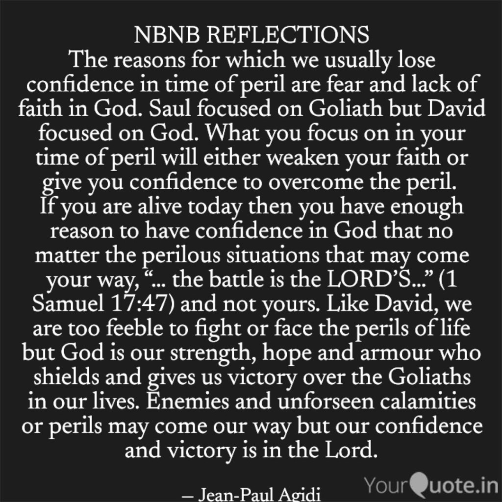 Dear friend in the Lord the reasons for which we usually lose confidence in time of peril is fear and lack of faith in God. Saul focused on Goliath but David focused on God. What you focus on in time of peril will either weaken your faith or give you confidence in time of peril. David proved his confidence in God when he said to Saul, ““The LORD who delivered me from the paw of the lion and from the paw of the bear will deliver me from the hand of this Philistine.” And Saul said to David, “Go, and the LORD be with you!” (1 Samuel 17:37). David further proved his confidence in the Lord when he approached the perilous Goliath. After Goliath had mocked him and spoken to him with contempt, David was not frightened nor discouraged but confidently said to Goliath “You come to me with a sword and with a spear and with a javelin, but I come to you in the name of the LORD of hosts, the God of the armies of Israel, whom you have defied. This day the LORD will deliver you into my hand, and I will strike you down and cut off your head. And I will give the dead bodies of the host of the Philistines this day to the birds of the air and to the wild beasts of the earth, that all the earth may know that there is a God in Israel…” ( 1 Samuel 17:45-46)